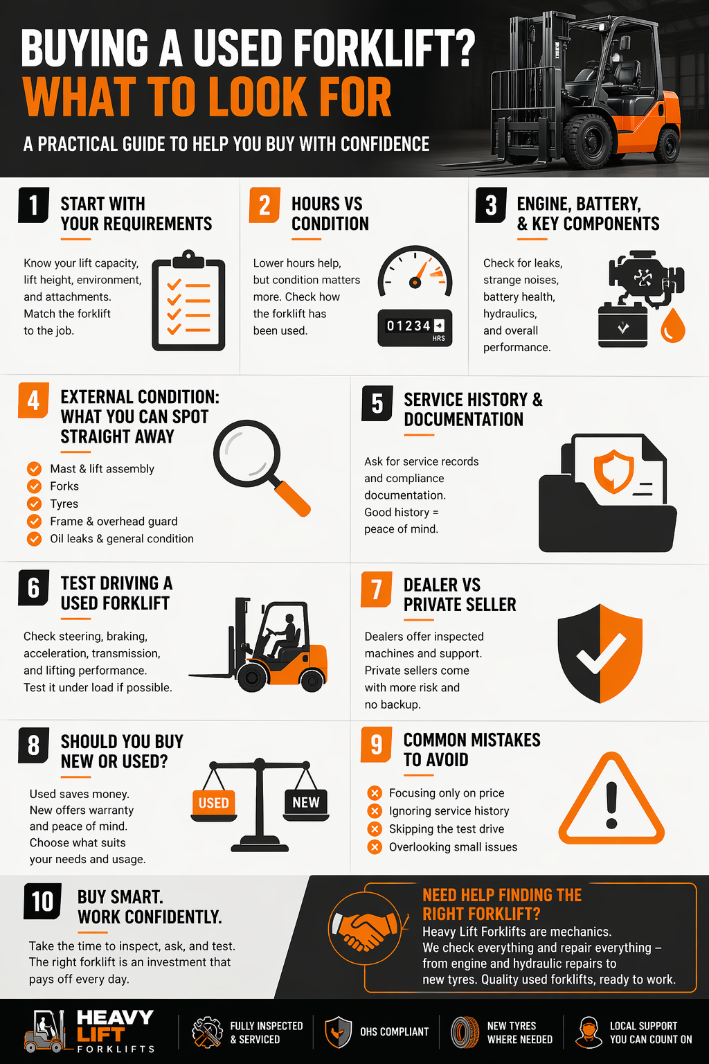 This is also where the source of the forklift matters. A privately sold machine might be cheaper, but you are taking on all the risk. On the other hand, buying from a supplier that properly inspects and services their forklifts can remove a lot of that uncertainty. For example, a fully serviced, OHS-compliant forklift that has been checked over before sale gives you a much clearer starting point. Add in ongoing support like mobile repairs and maintenance, and it becomes a lot easier to keep things running without unexpected disruptions.
